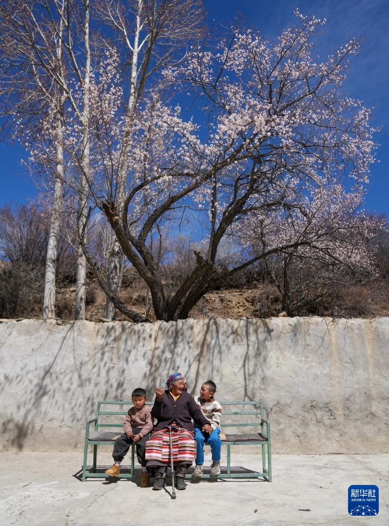 次仁桑姆(中)和两位晚辈在宗卡村家中的院子里聊天(3月26日摄)。