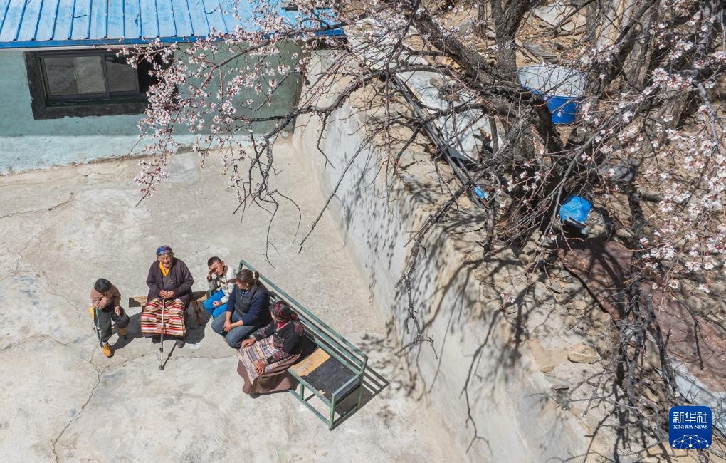 3月26日,次仁桑姆(左二)和晚辈在宗卡村家中的院子里聊天(无人机照片)。