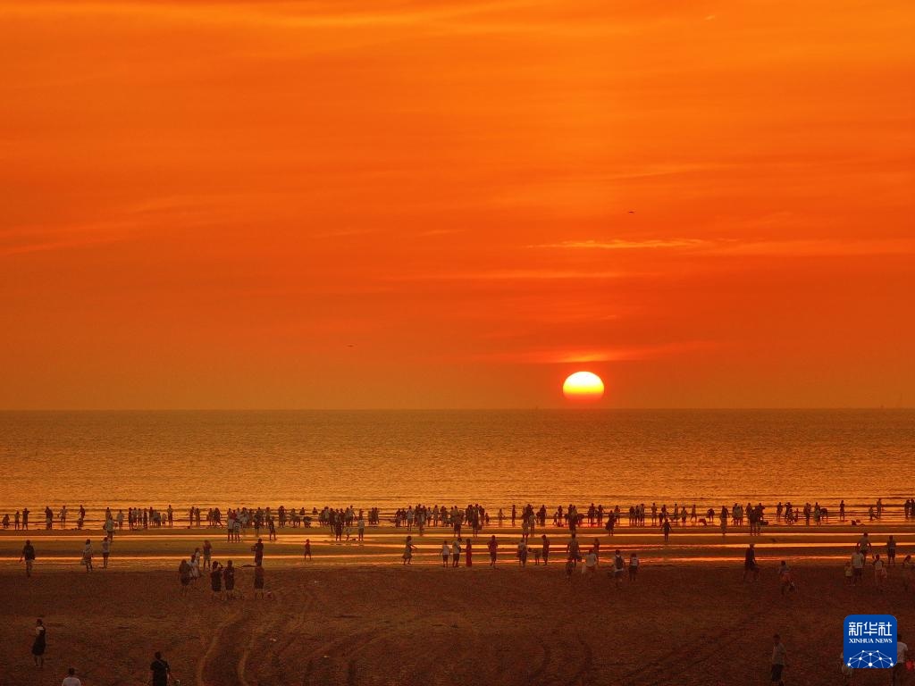 游客在江苏南通江海交汇处的启东黄金海滩欣赏日出美景(无人机照片,2024年8月10日摄)。
