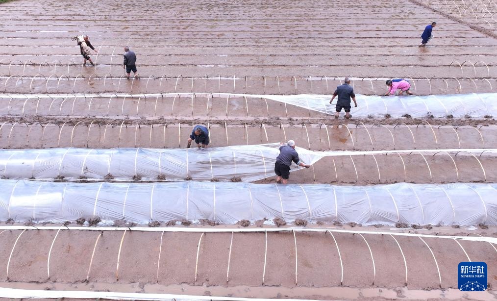 3月31日,村民在四川省眉山市仁寿县板桥镇青龙社区进行水稻集中育秧(无人机照片)。