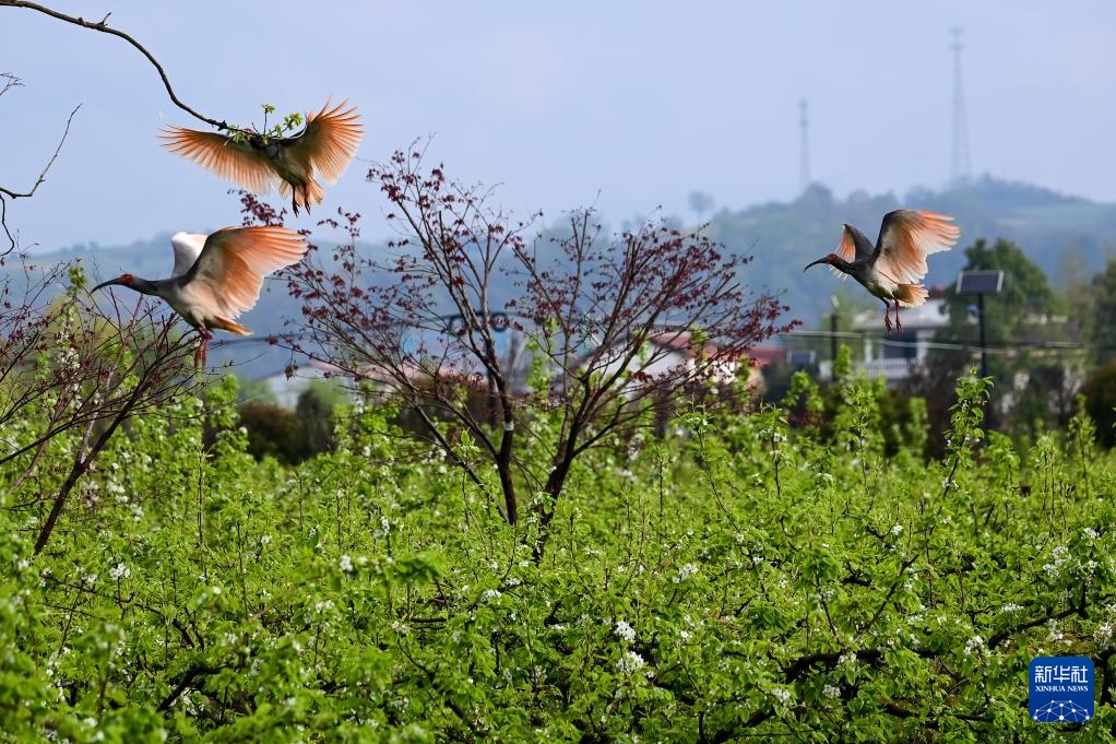 3月30日,朱鹮从洋县草坝村的梨树上方飞过。