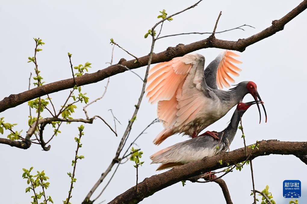 3月30日,洋县草坝村,一对朱鹮夫妇在枝头“踩背”。