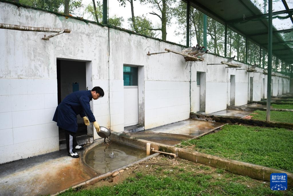 3月30日,陕西汉中朱鹮国家级自然保护区朱鹮人工繁育中心的饲养员为朱鹮投喂泥鳅。