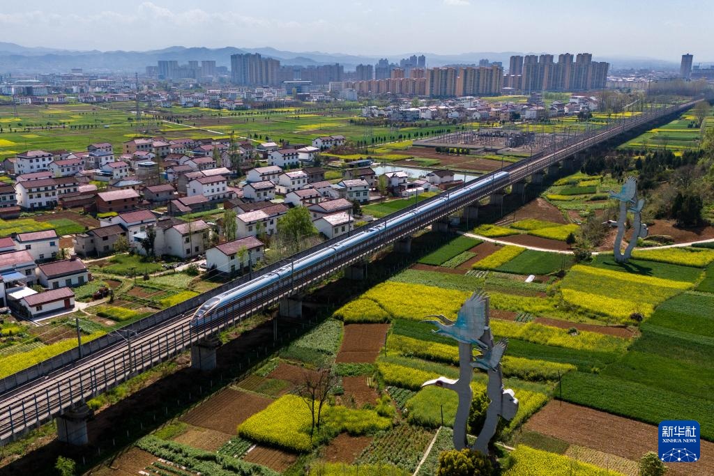 高铁列车驶过洋县洋州街道何家村附近的朱鹮雕塑(3月31日摄,无人机照片)。