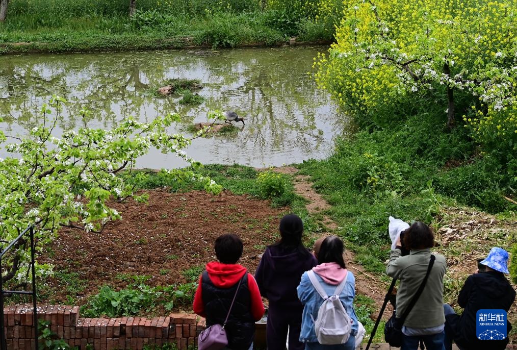 3月29日,观鸟爱好者在洋县草坝村的一处水塘边观看朱鹮觅食。
