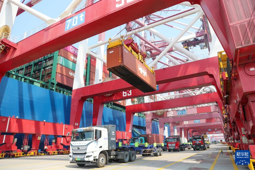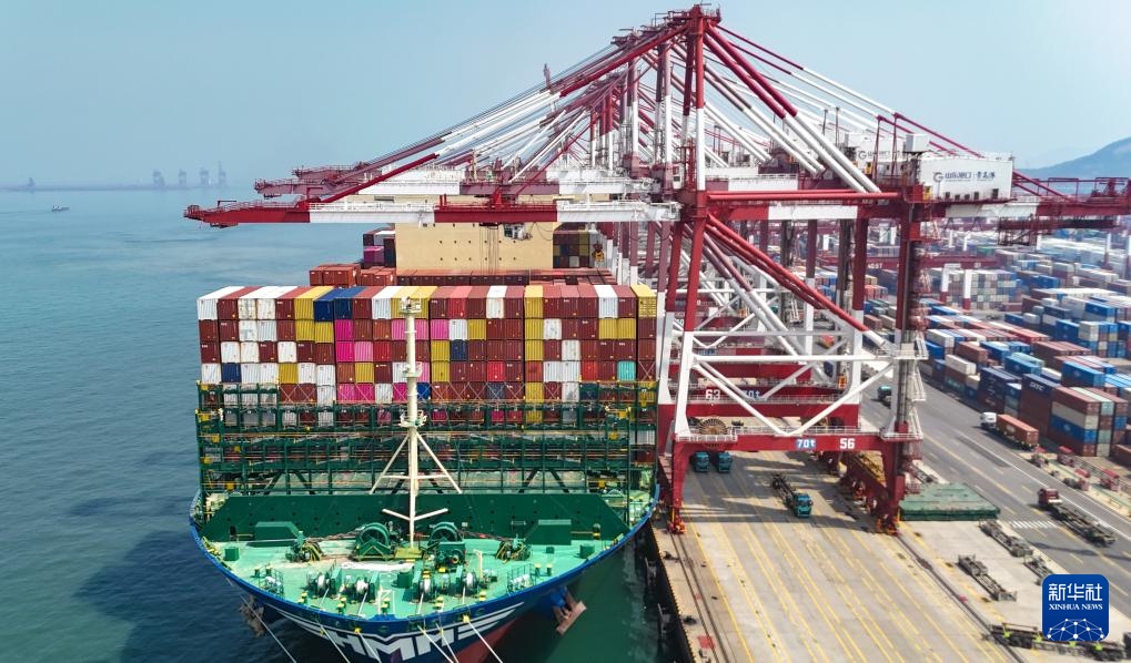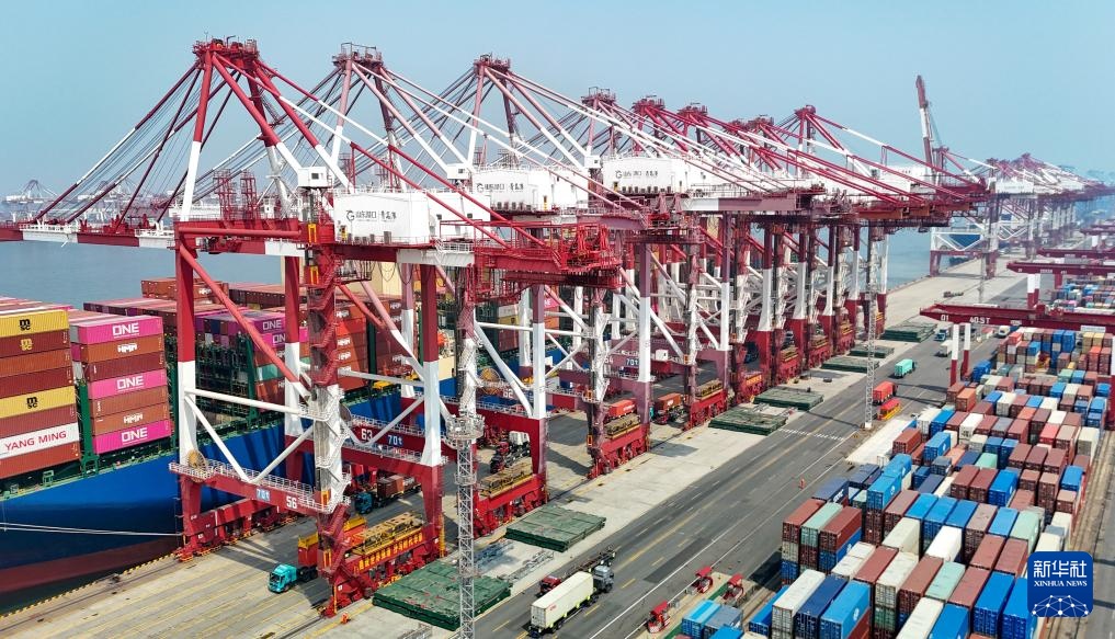 4月1日,货轮在山东港口青岛港装卸外贸集装箱(无人机照片)。