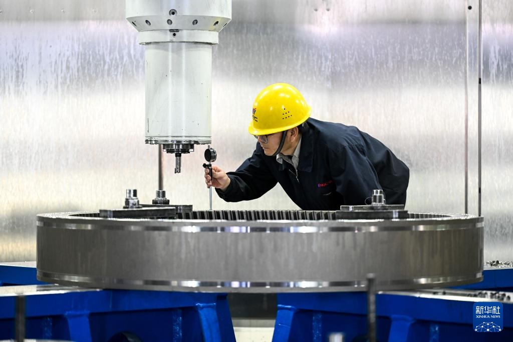 3月31日,工人在南高齿(包头)传动设备有限公司测量齿轮精度。