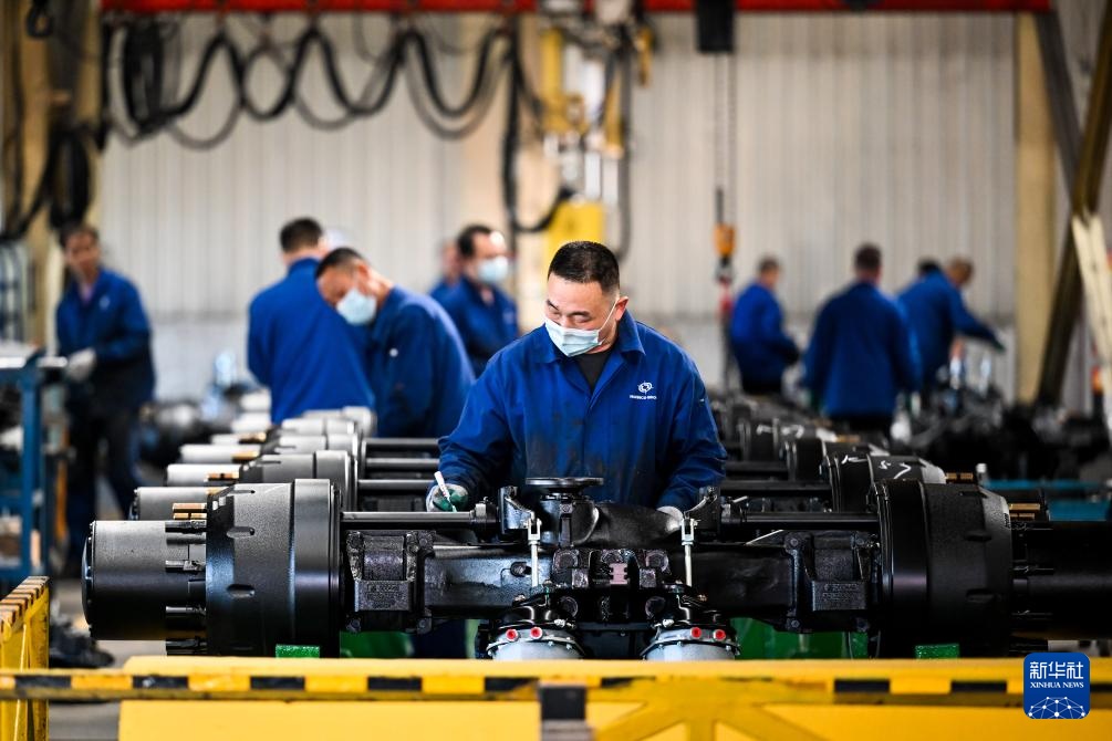 3月31日,工人在包头北奔重汽桥箱有限公司装配车桥总成。