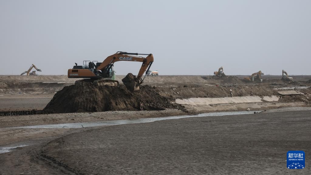 4月1日,大型机械在湿地修复工作现场作业。