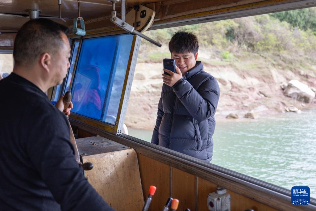 3月30日,在长江重庆忠县段,秦大益(左)驾驶“渝忠客2180”客轮返回洋渡码头,他的儿子秦源泽(右)在社交平台直播老船的最后一趟航程。