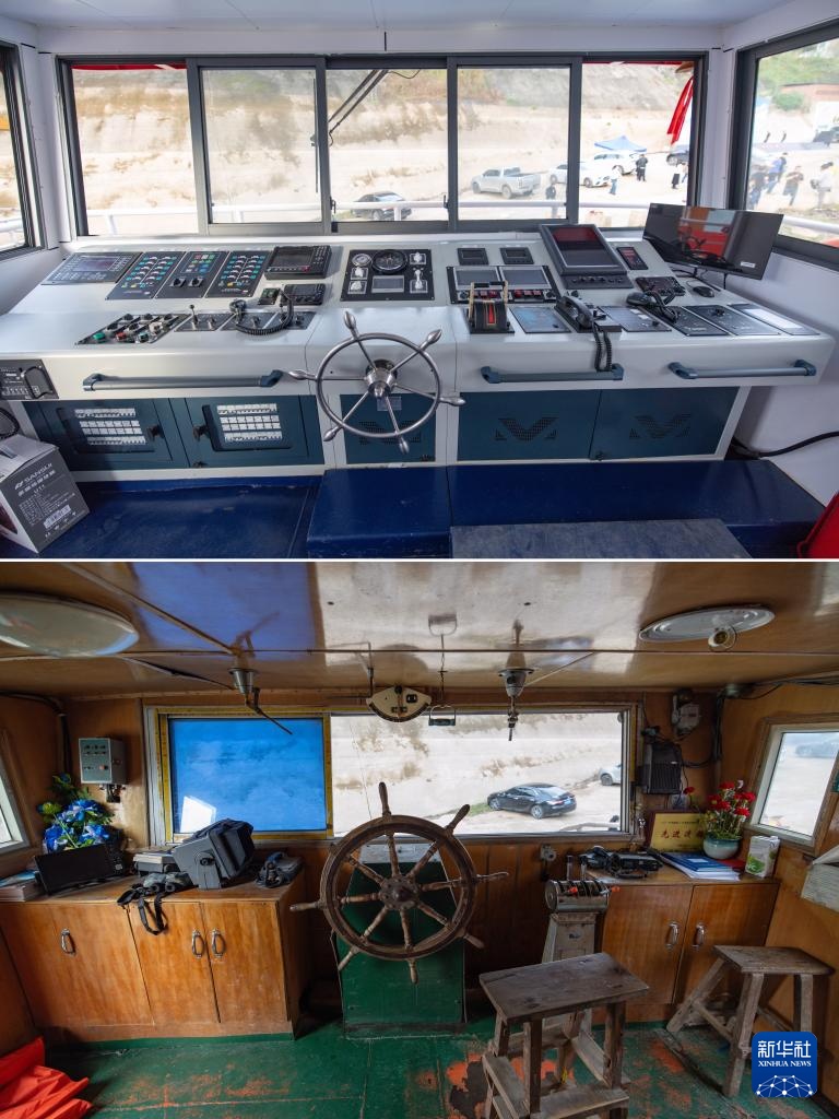 拼版照片:上图为3月30日在重庆忠县洋渡码头拍摄的“新渝忠客2180”客轮驾驶舱;下图为3月30日在重庆忠县洋渡码头拍摄的“渝忠客2180”客轮驾驶舱。