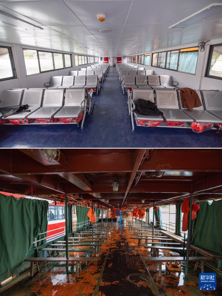 拼版照片:上图为3月30日在重庆忠县洋渡码头拍摄的“新渝忠客2180”客轮客舱;下图为3月30日在重庆忠县洋渡码头拍摄的“渝忠客2180”客轮客舱。