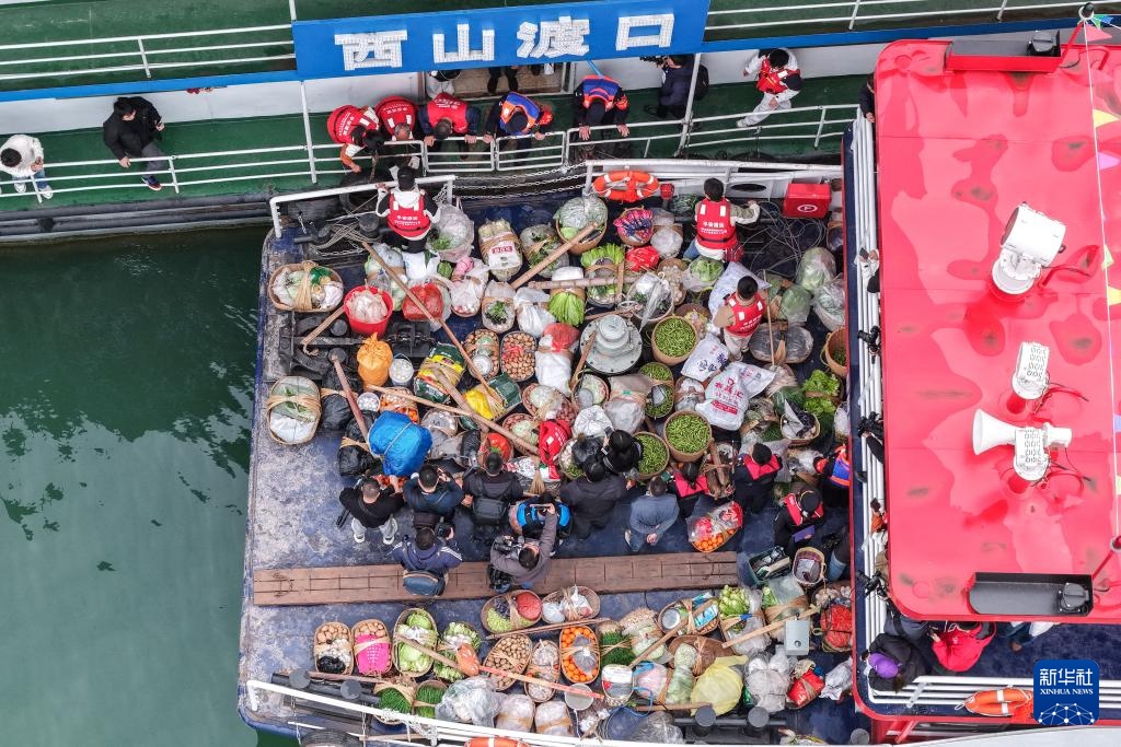 3月31日,“新渝忠客2180”客轮抵达忠县县城后,菜农下船前往集市售卖农特产品(无人机照片)。