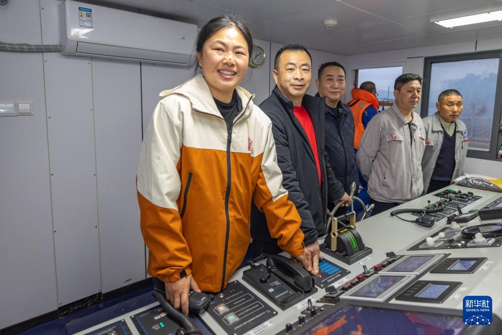 3月31日,在长江重庆忠县段,“新渝忠客2180”客轮船长秦大益(左二)在驾驶舱操控船舶,儿子秦源泽(左一)在网络平台上进行直播。