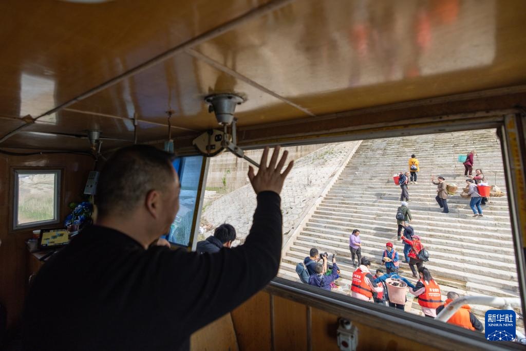 3月30日,在长江重庆忠县段,秦大益向搭乘最后一趟“渝忠客2180”客轮的乘客挥手告别。