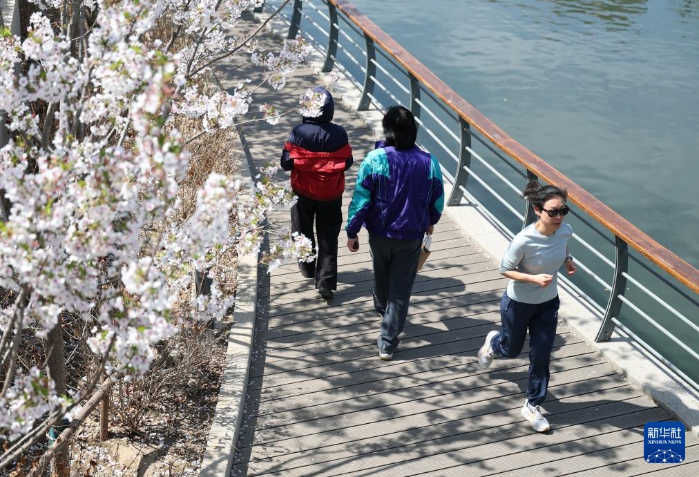 市民在鲜花盛开的北京市坝河岸边跑步锻炼(4月1日摄)。