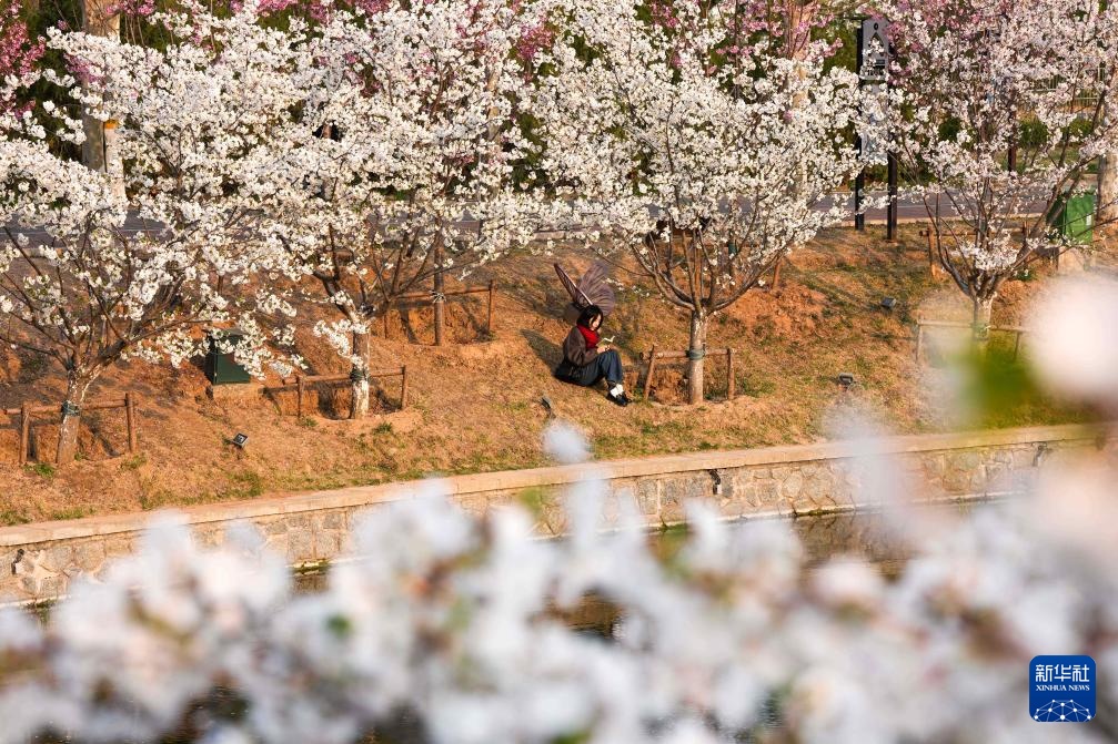 在北京朝阳区亮马河国际风情水岸,游客在岸边盛开的樱花下阅读(4月1日摄)。