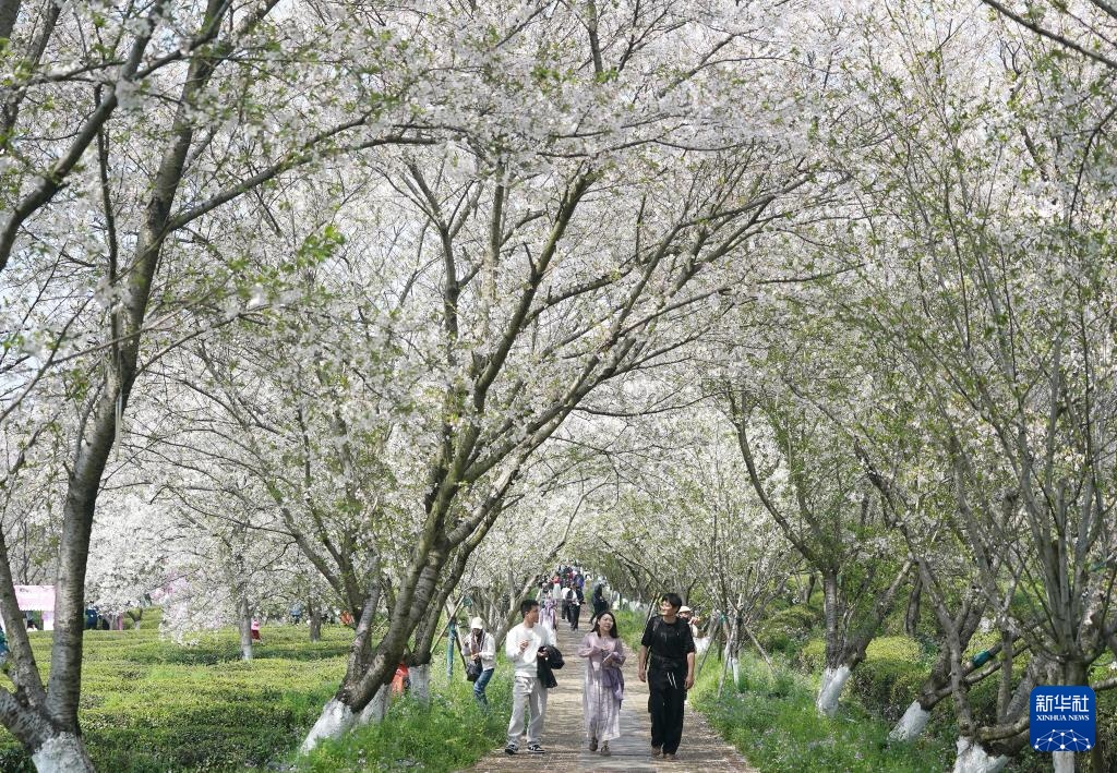 近日,江西省南昌县凤凰沟景区樱花进入盛花期。景区2000余亩樱花谷内,早樱、晚樱、迎春樱等20余个品种樱花次第绽放,春风拂面,花海连片,吸引不少游客前来赏花踏青。