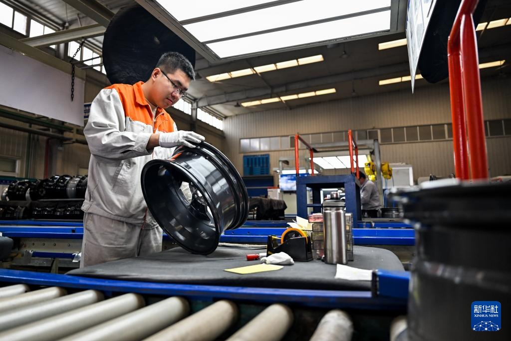 4月1日,工人在包头盛泰汽车零部件制造有限公司铝合金轮毂生产线上作业。