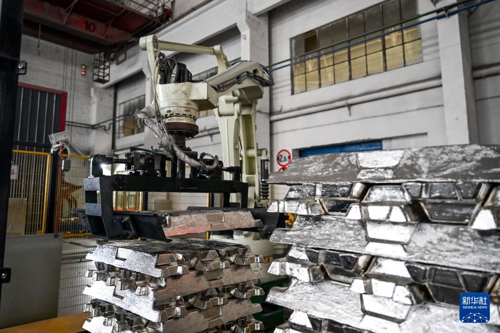 4月1日,机械臂在包头铝业有限公司铸铝生产线上搬运铝锭。