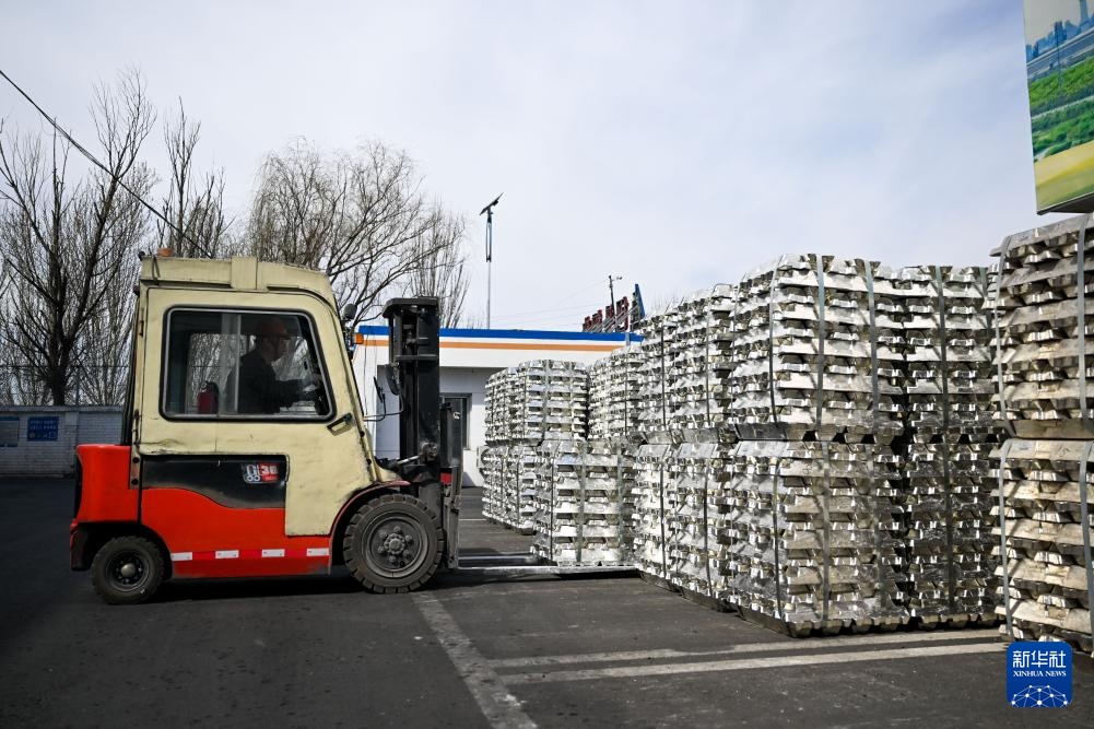 4月1日,工人在包头铝业有限公司驾驶叉车搬运铝锭。