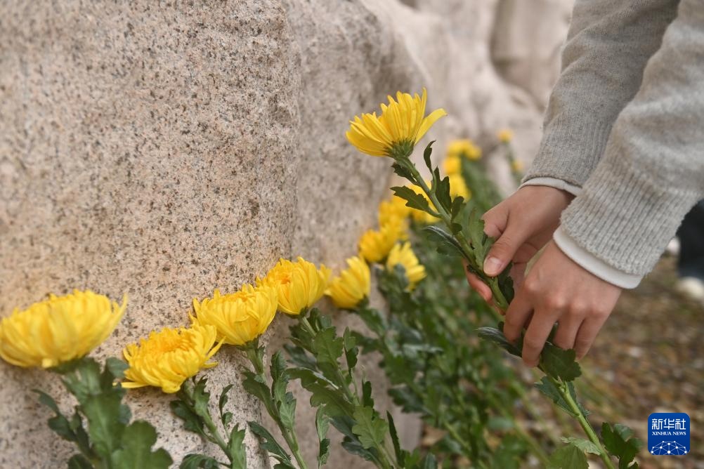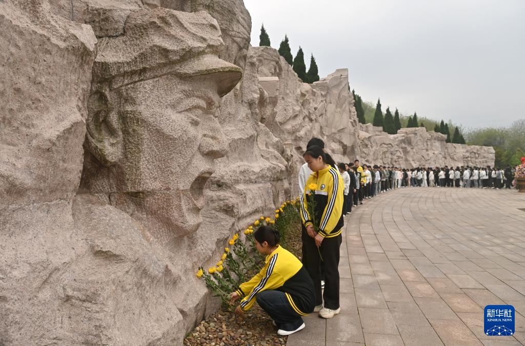 4月2日,在广西全州县红军长征湘江战役纪念园凭吊广场,人们在给红军英烈献花。