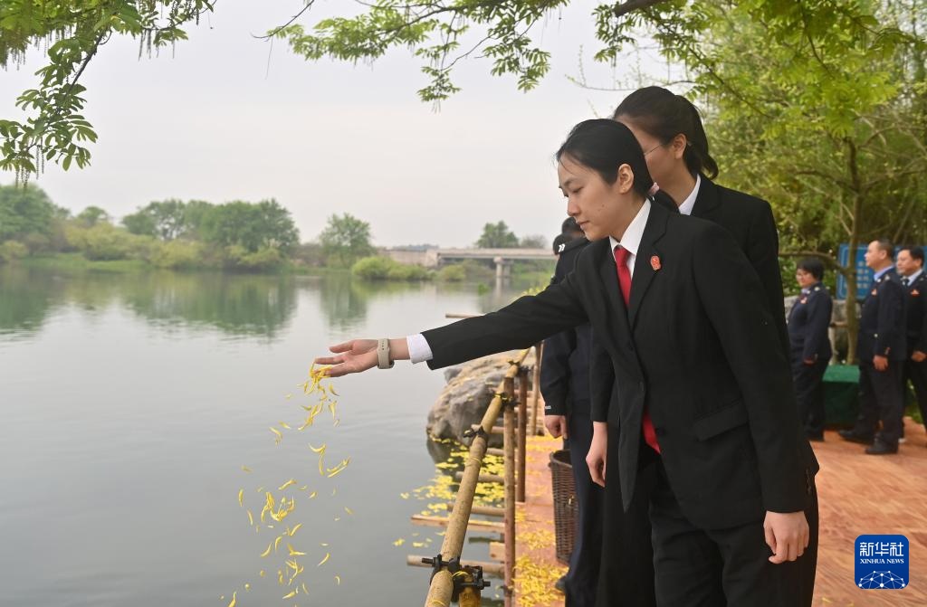 4月2日,在广西全州县大坪渡口,人们向湘江撒花瓣祭奠红军英烈。