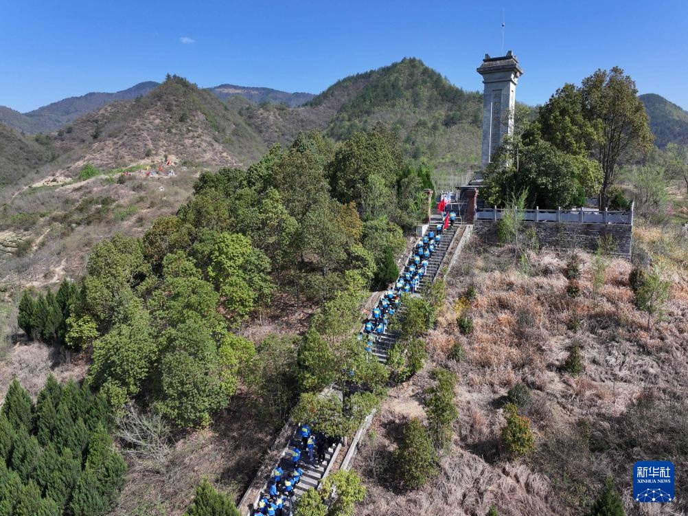 4月1日,在湖北省襄阳市保康县歇马镇烈士陵园,保康县歇马镇小学学生参加清明祭英烈主题教育活动(无人机照片)。