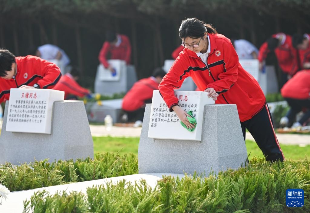 4月2日,在位于河北省石家庄市的华北军区烈士陵园,学生为烈士擦拭墓碑。