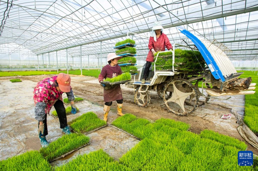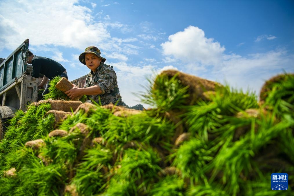4月1日,农民在江西省九江市都昌县蔡岭镇杨湾村育秧基地起运秧苗,准备机插早稻。
