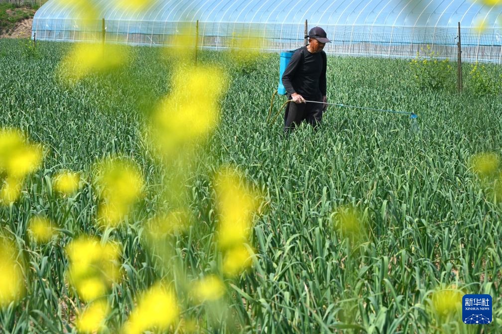 4月2日,河南省开封市鼓楼区仙人庄街道新庄村农民在蒜田里喷施农药防治病虫害。