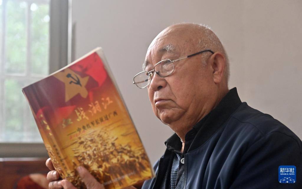 4月2日,在广西全州县才湾镇才湾村的家里,蒋石林老人在阅读有关湘江战役历史的书籍。