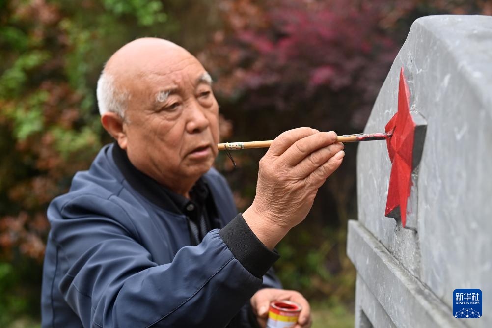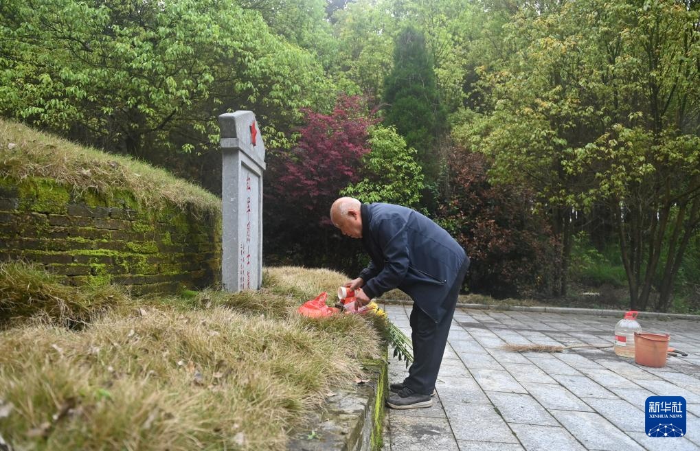4月2日,在广西全州县米花山红军烈士墓,蒋石林老人在擦洗红军墓碑。