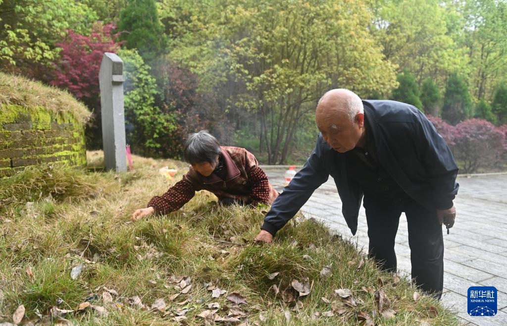 4月2日,在广西全州县米花山红军烈士墓,蒋石林老人(右)和老伴李桂英在清除红军烈士墓边的杂草落叶。