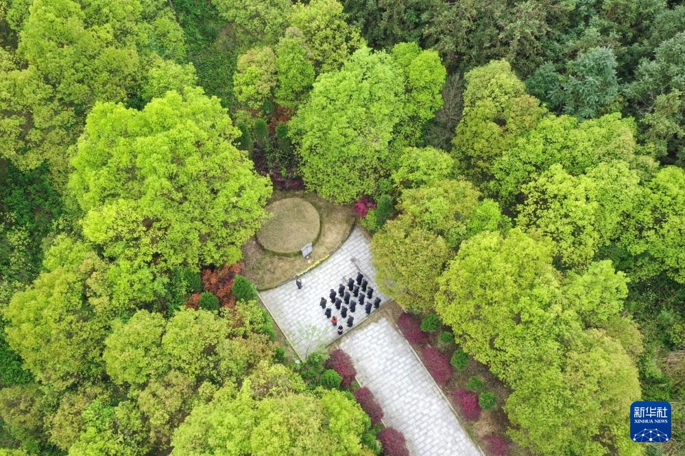 4月2日,在广西全州县米花山红军烈士墓,蒋石林老人(前)在给前来祭扫烈士墓的人讲述自己一家人守墓的历史(无人机照片)。