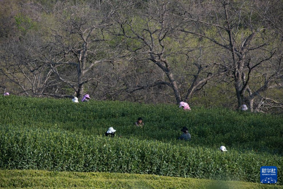 4月2日,采茶工人在敬亭山山脚下的一处茶园里采茶,远处是敬亭山。