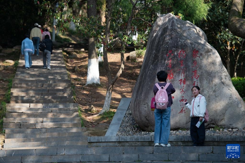 4月2日,游客在位于安徽宣城的敬亭山国家森林公园游览,石碑上刻有李白的《独坐敬亭山》。