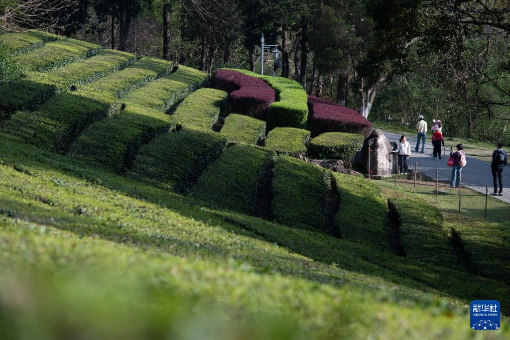 4月1日,在位于安徽宣城的敬亭山国家森林公园,游客经过敬亭山山腰处的一处茶园。