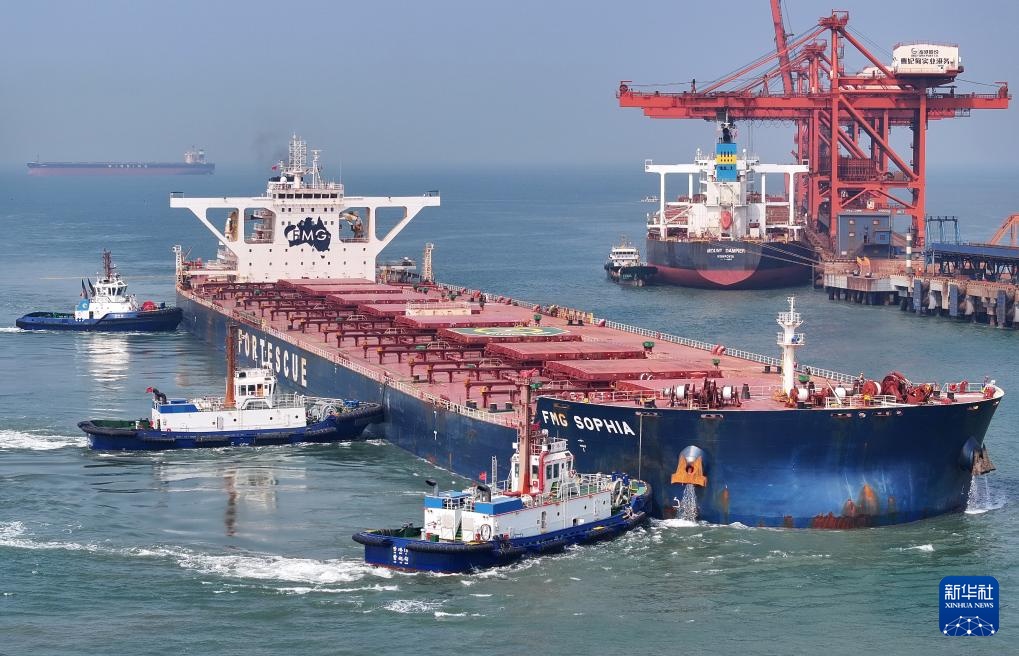 4月15日,一艘轮船在拖轮协助下驶离唐山港曹妃甸港区矿石码头(无人机照片)。