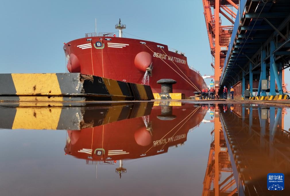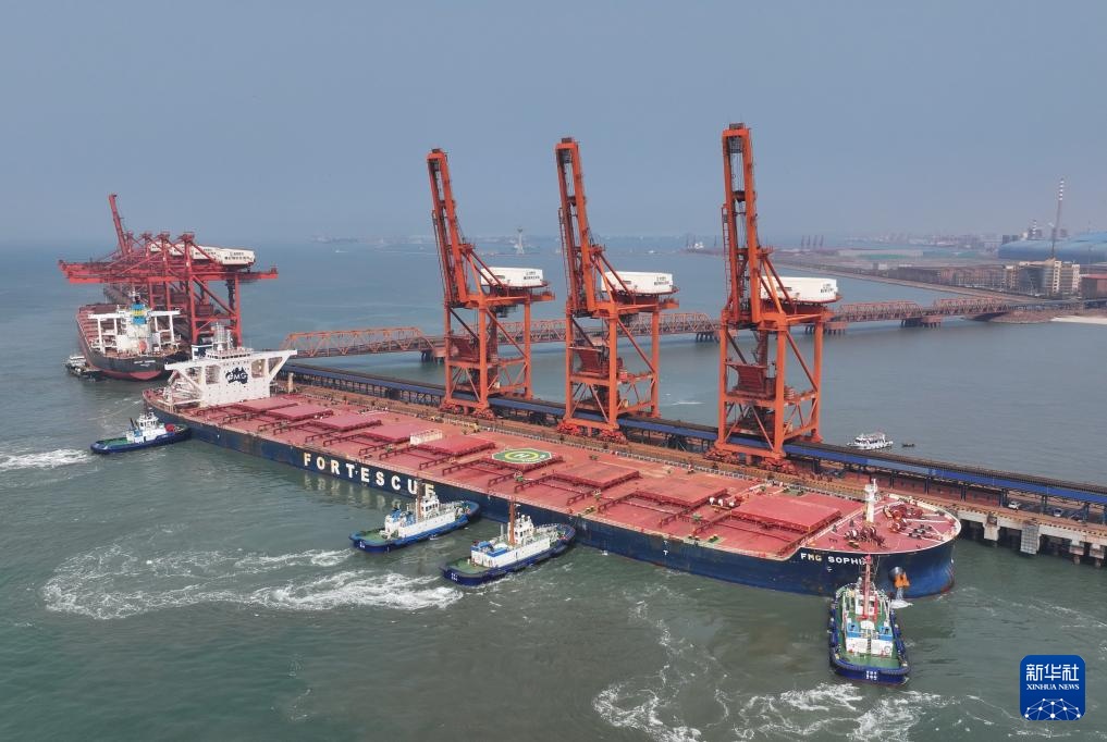 4月15日,一艘轮船靠泊在唐山港曹妃甸港区矿石码头卸载(无人机照片)。
