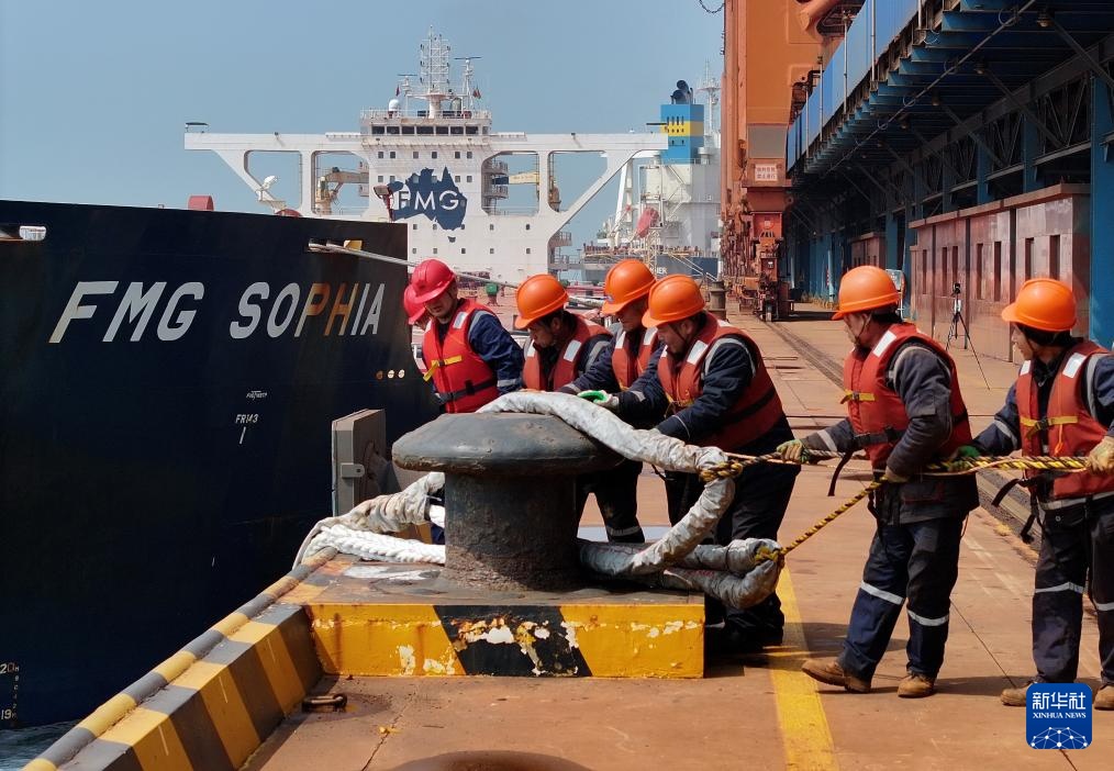 4月15日,工人在唐山港曹妃甸港区矿石码头为一艘正在靠泊的轮船系缆绳(无人机照片)。