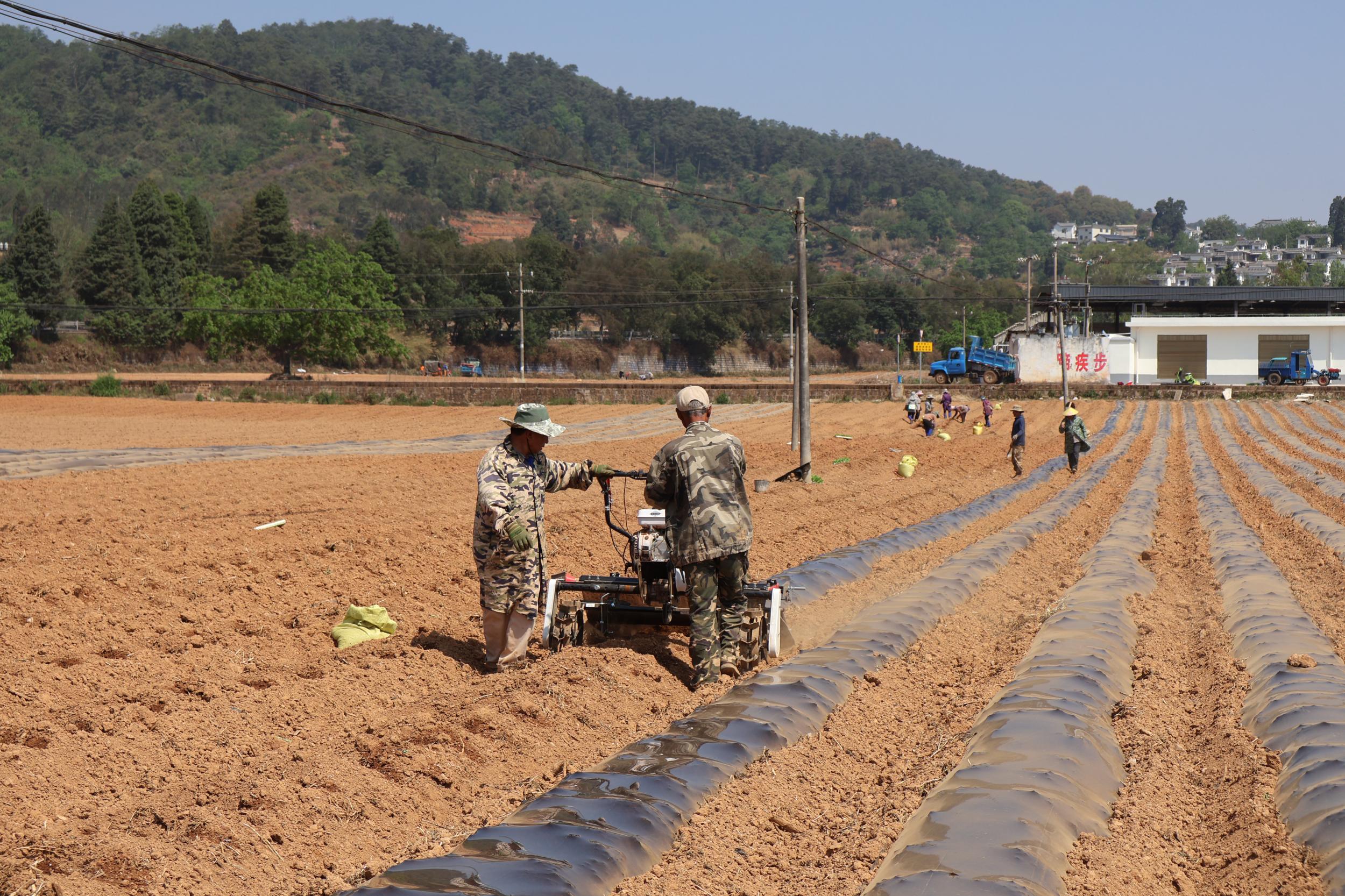 在西三镇云产卷烟高端特色烟叶标杆示范区,设备轰鸣作业,覆膜机来回穿梭,高效完成盖膜、拉滴灌等工序。今年首次在该镇推广的膜下滴灌移栽技术,为烟苗生长筑起“保温棚”和“供水网”。