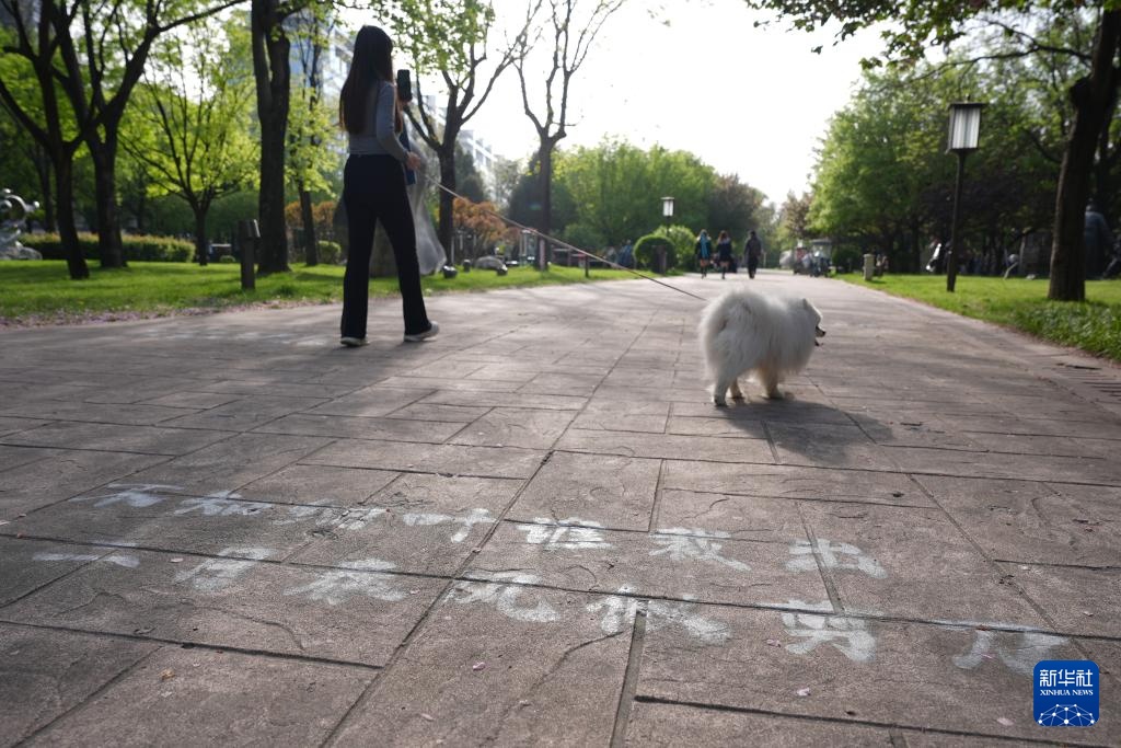 市民在位于西安曲江新区的唐诗文化主题公园散步(4月9日摄)。