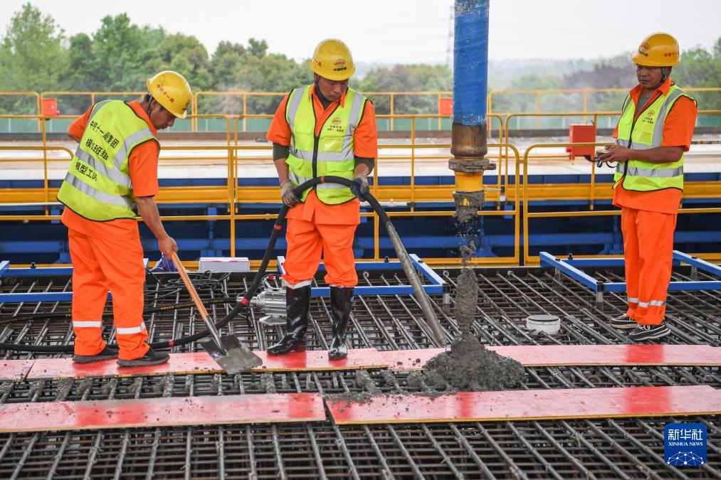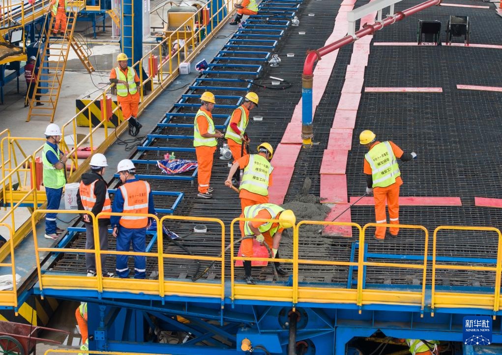 4月16日,工作人员在制作首榀箱梁(无人机照片)。