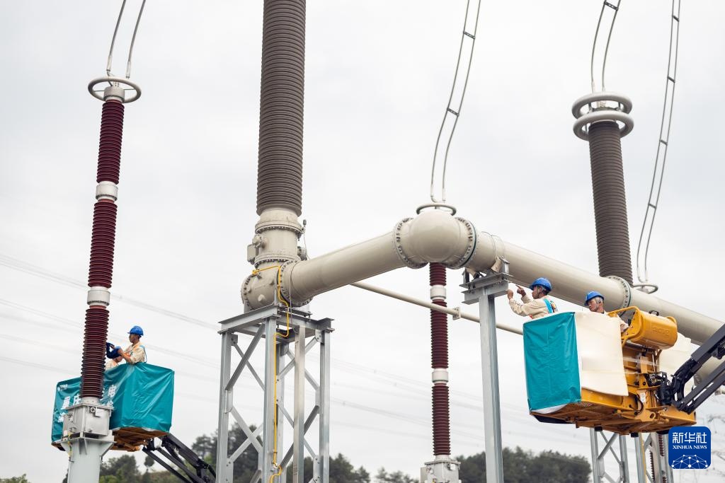 4月15日,检修人员在“疆电入渝”工程渝北换流站换流变进线区域检修。
