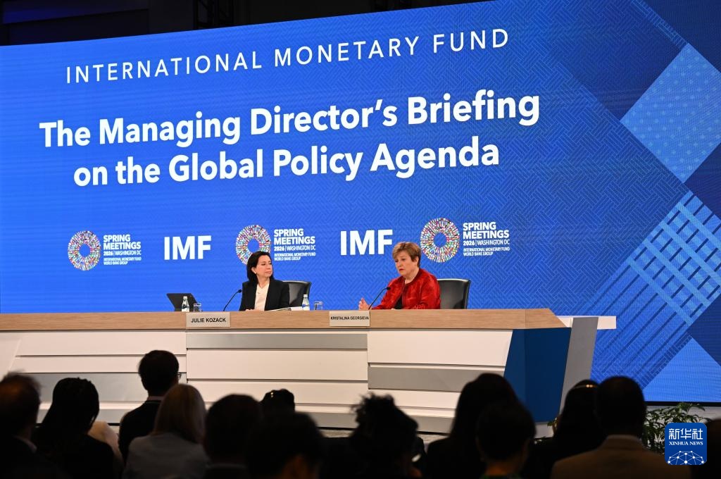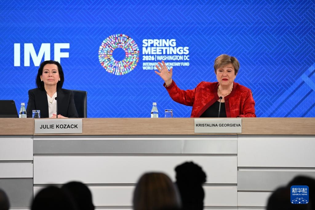 4月15日,在美国首都华盛顿,国际货币基金组织(IMF)总裁格奥尔基耶娃(右)在IMF和世界银行春季会议期间的新闻发布会上讲话。