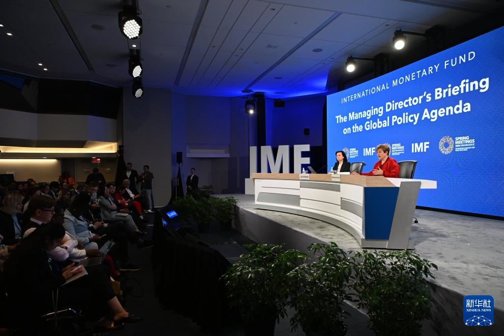 4月15日,在美国首都华盛顿,国际货币基金组织(IMF)总裁格奥尔基耶娃(上右)在IMF和世界银行春季会议期间的新闻发布会上讲话。