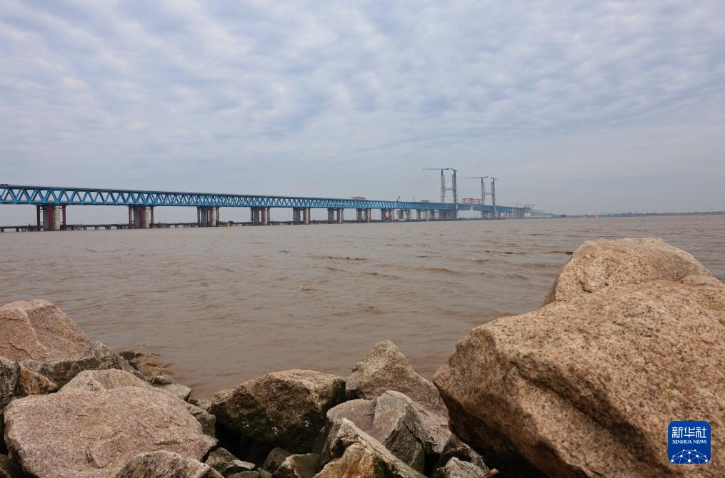 4月16日拍摄的建设中的崇启公铁长江大桥。
