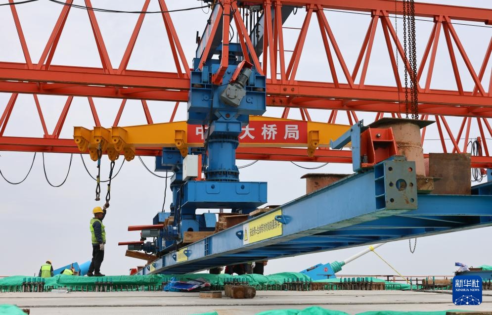 4月16日拍摄的崇启公铁长江大桥铁路作业面施工现场。