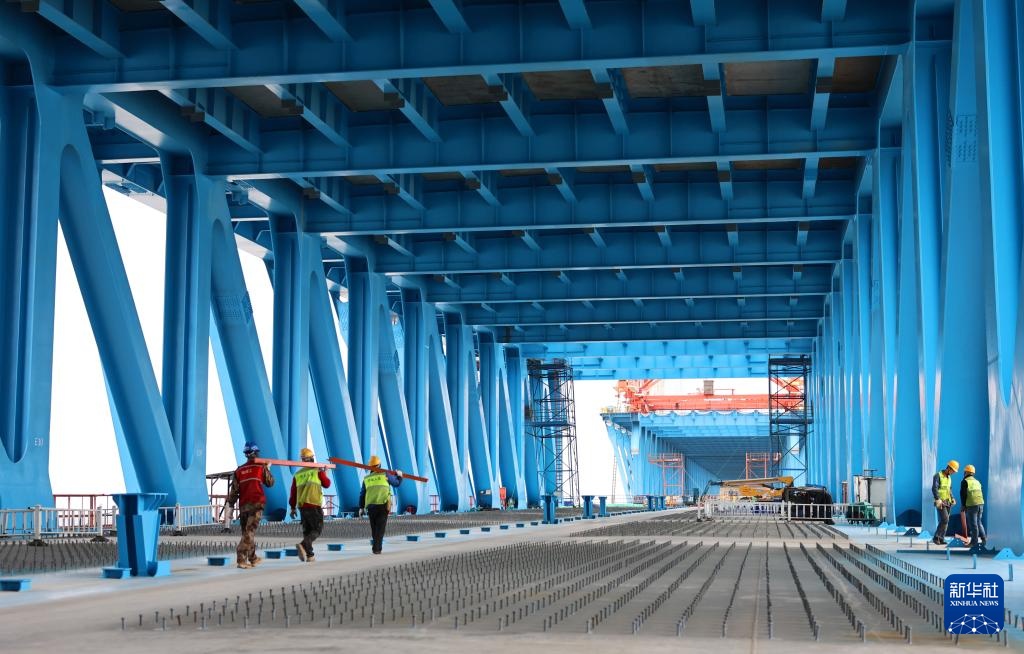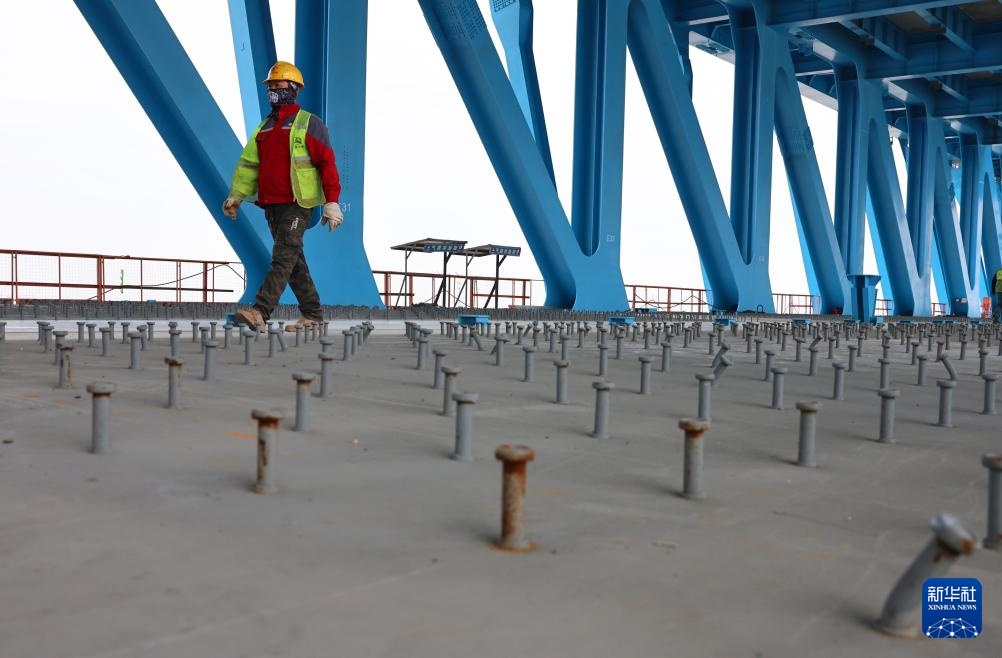 4月16日,工人在崇启公铁长江大桥公路作业面操作架板机进行公路桥面板铺设。